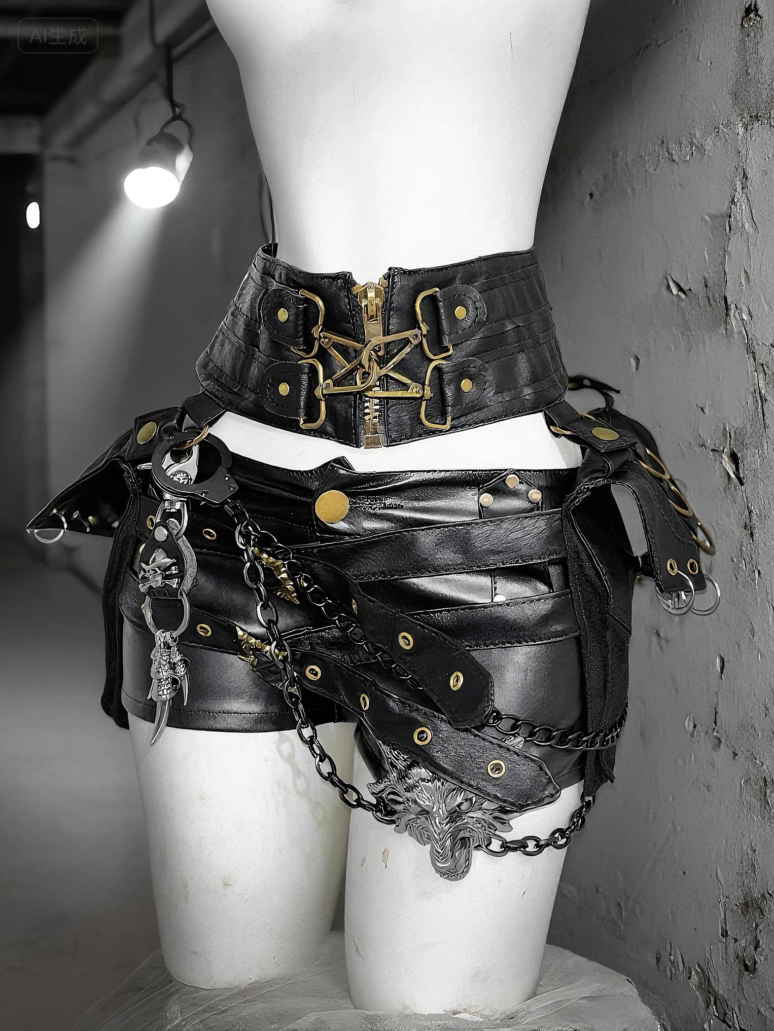A striking wolf head emblem decorates the front, paired with layered black chains and a skull dagger charm, creating a statement piece full of gothic energy. Adjustable waist straps with grommets and buckles ensure a secure, flexible fit, making them practical as well as eye-catching.