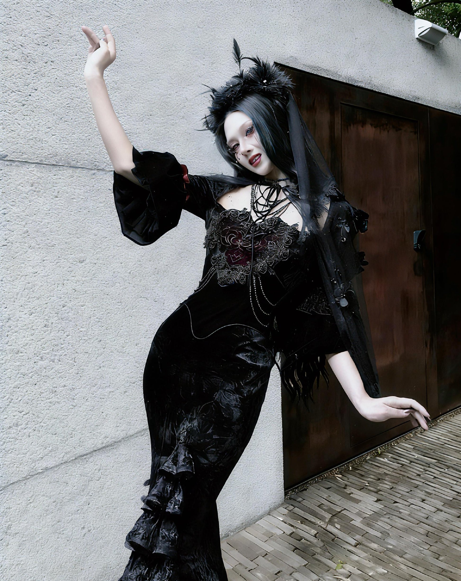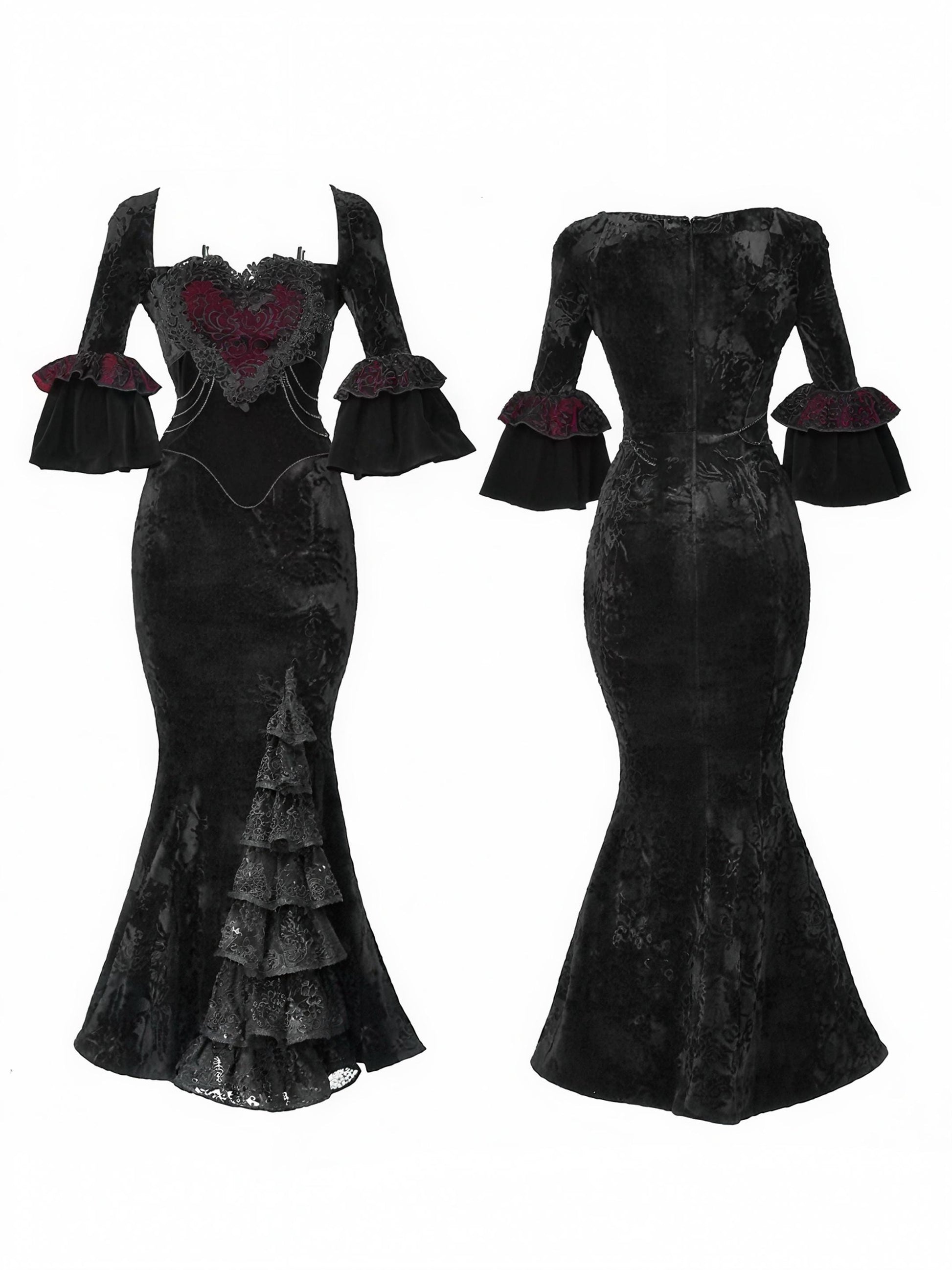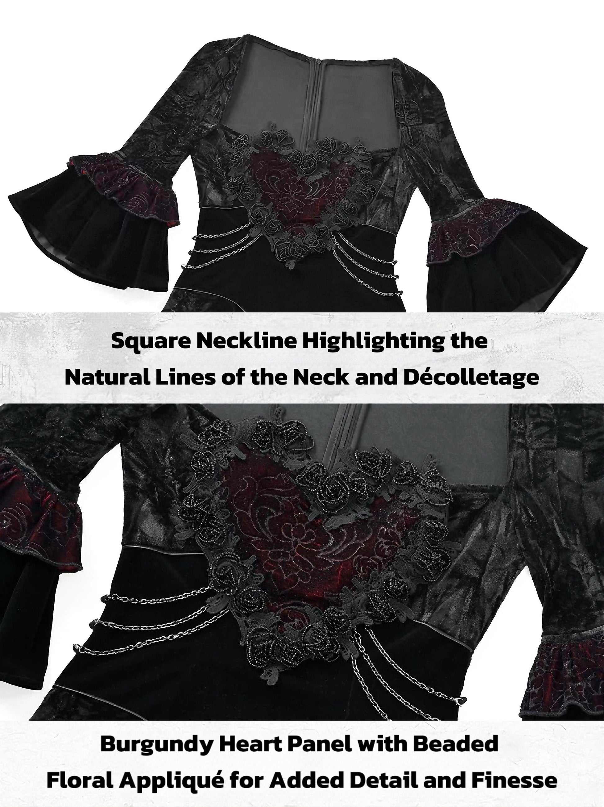 This sculpted fishtail dress is made from luxurious black crushed velvet, creating a deep, moody sheen under candlelight. The bodice is crowned with a burgundy velvet heart, framed with hand-beaded floral appliqué, evoking the nobility of a vampire duchess.
