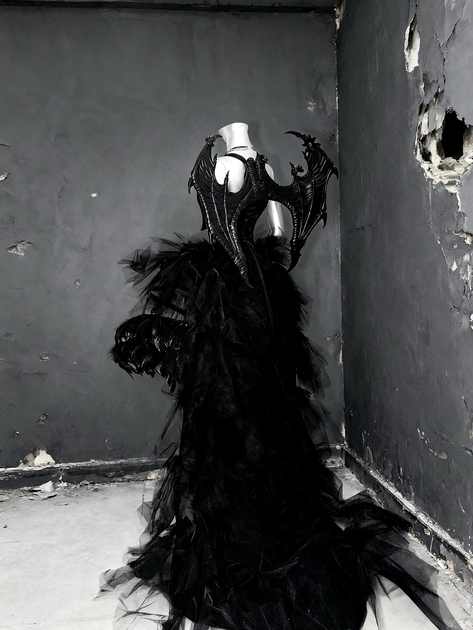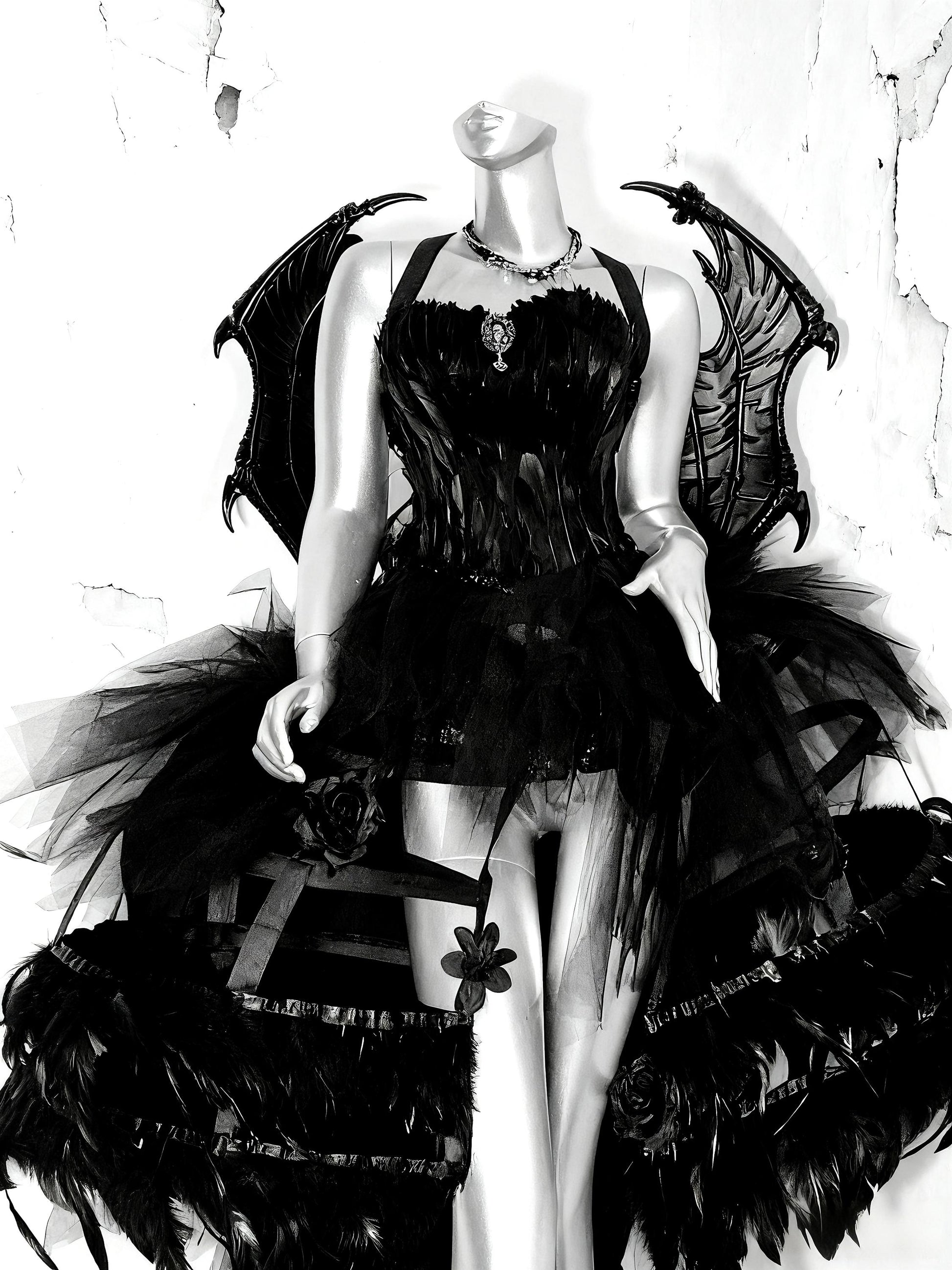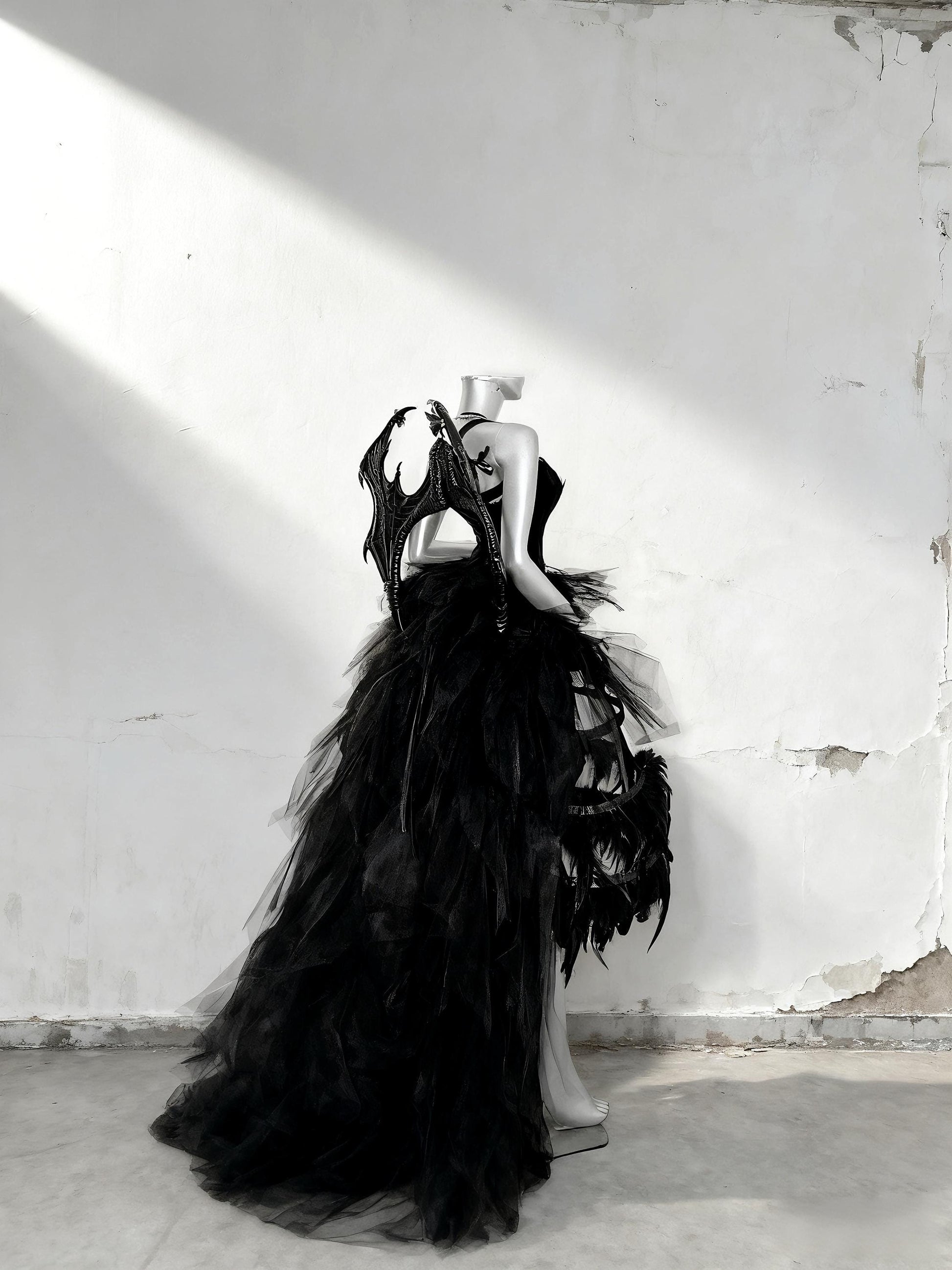 Step into the realm of fantasy with this original gothic couture gown. Featuring a dramatic fusion of feathers, lace, and layered tulle, this piece is perfect for gothic weddings, fantasy photoshoots, or statement stagewear.
