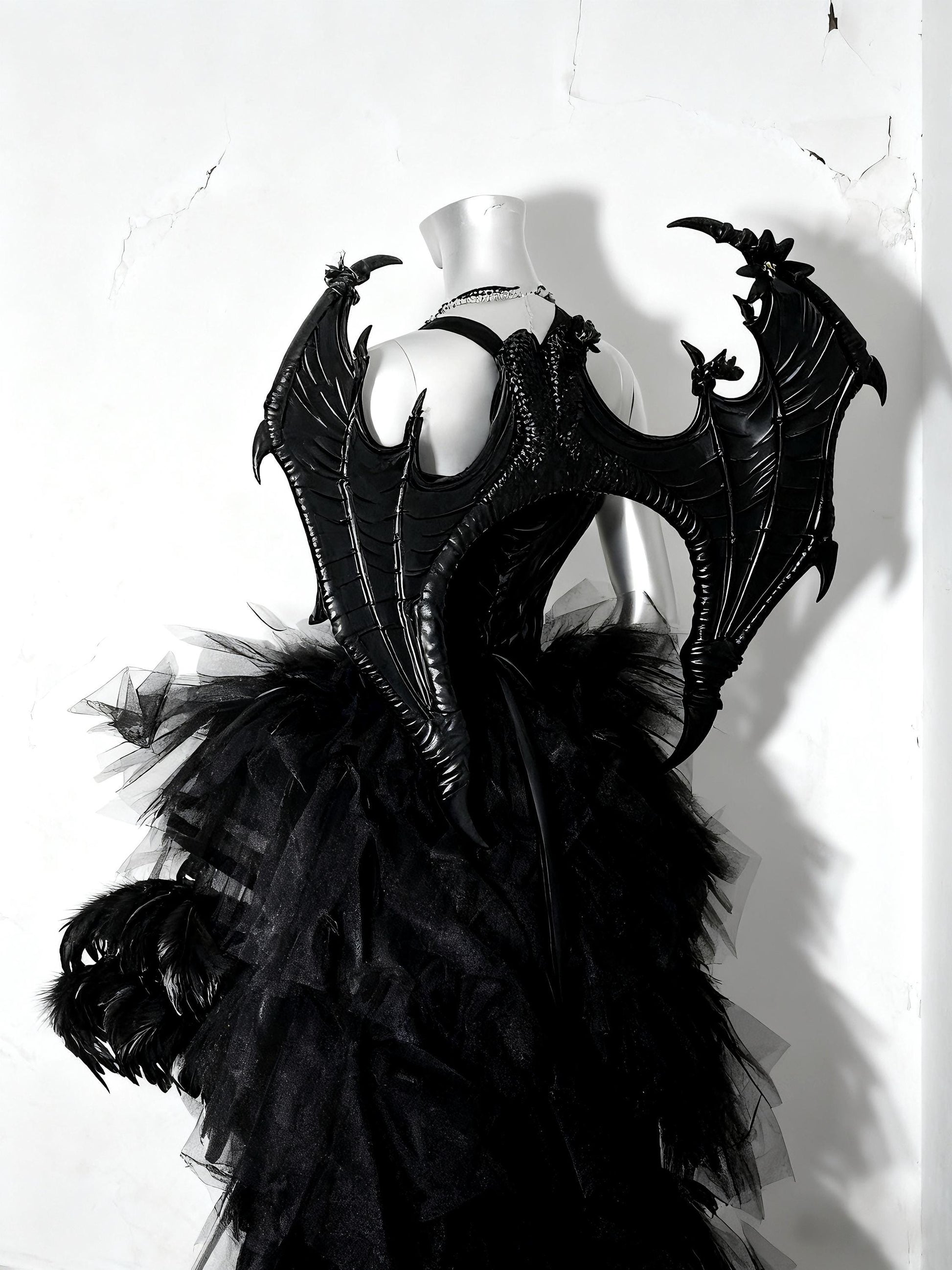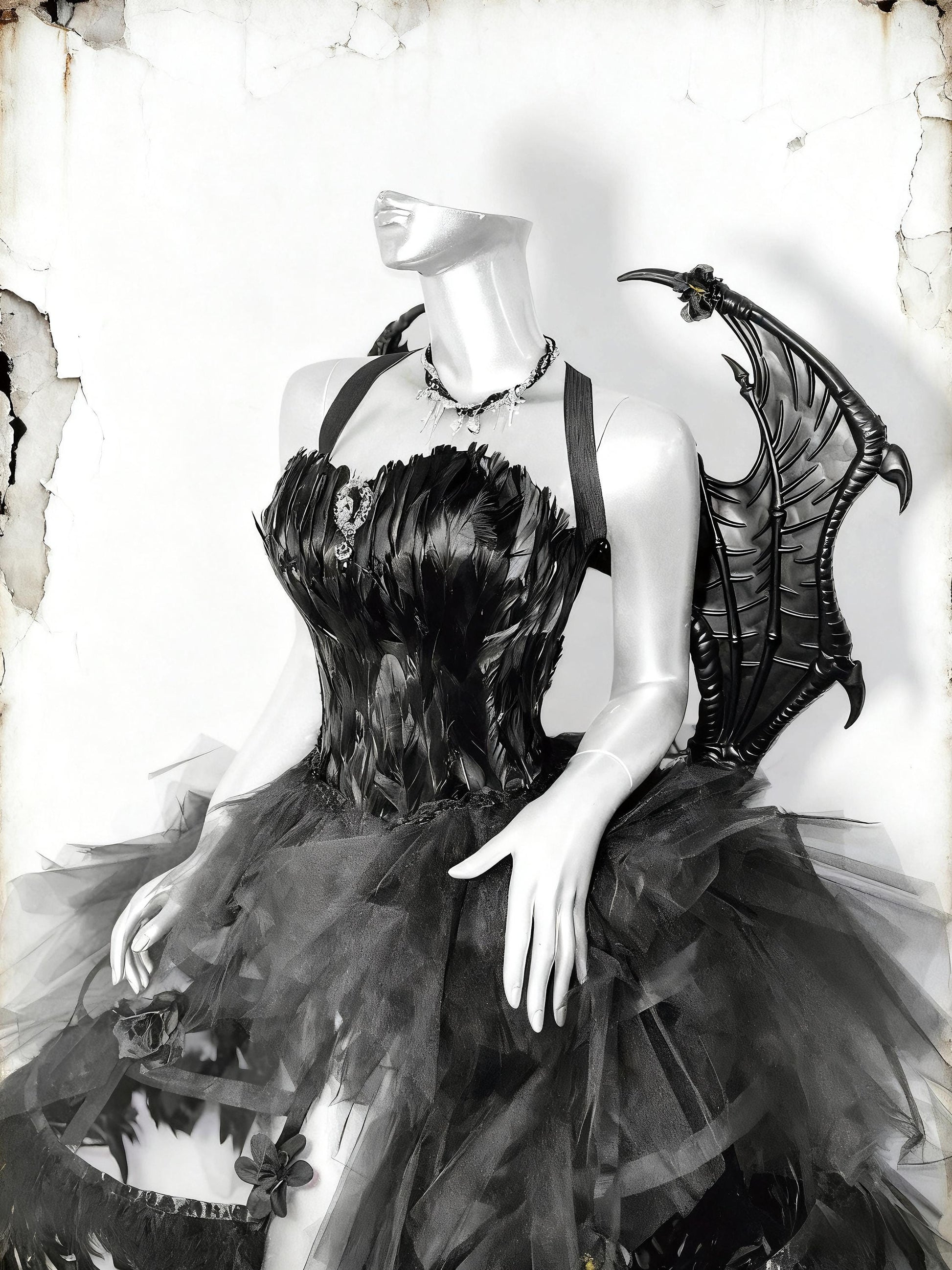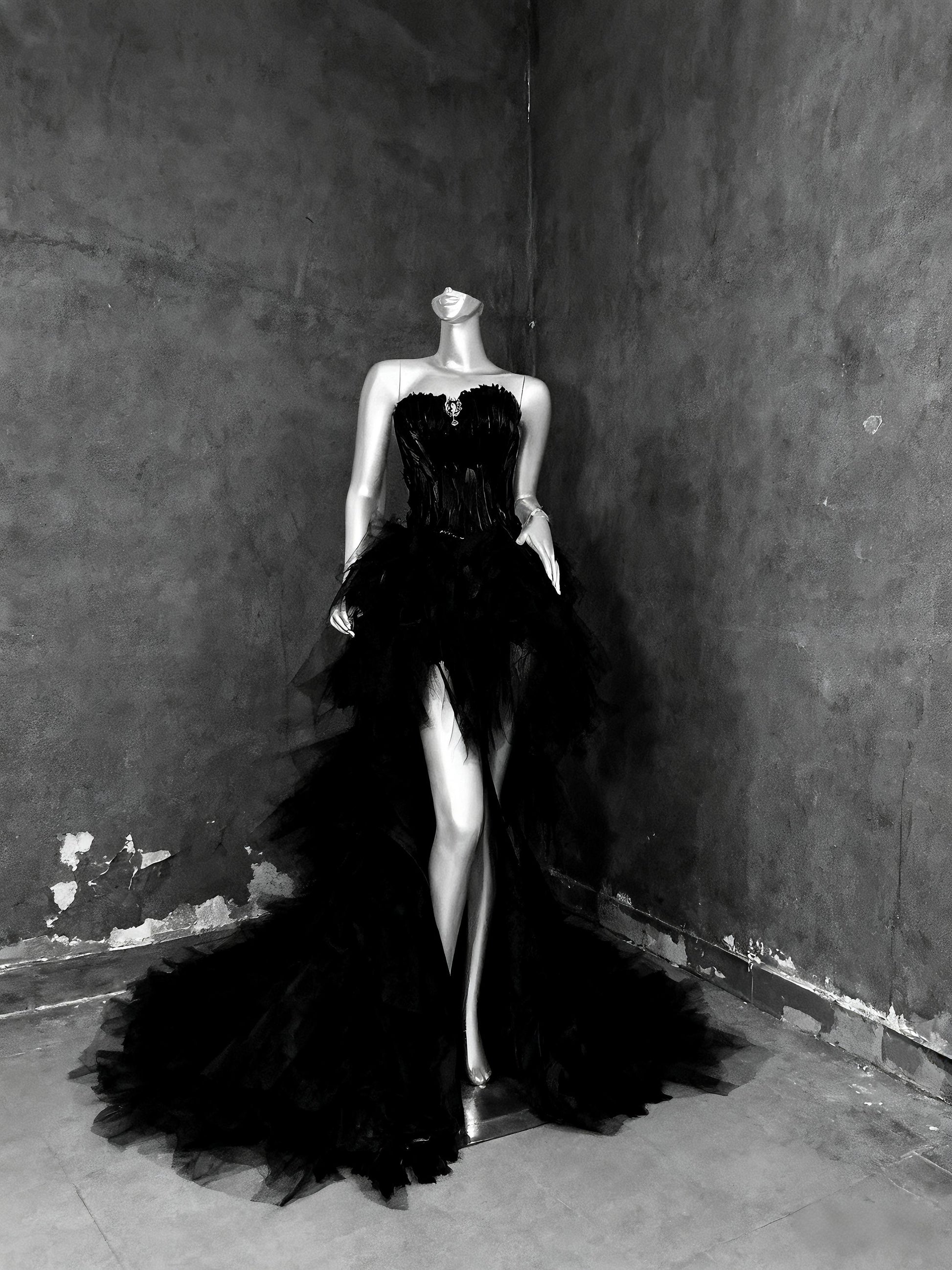 Step into the realm of fantasy with this original gothic couture gown. Featuring a dramatic fusion of feathers, lace, and layered tulle, this piece is perfect for gothic weddings, fantasy photoshoots, or statement stagewear.