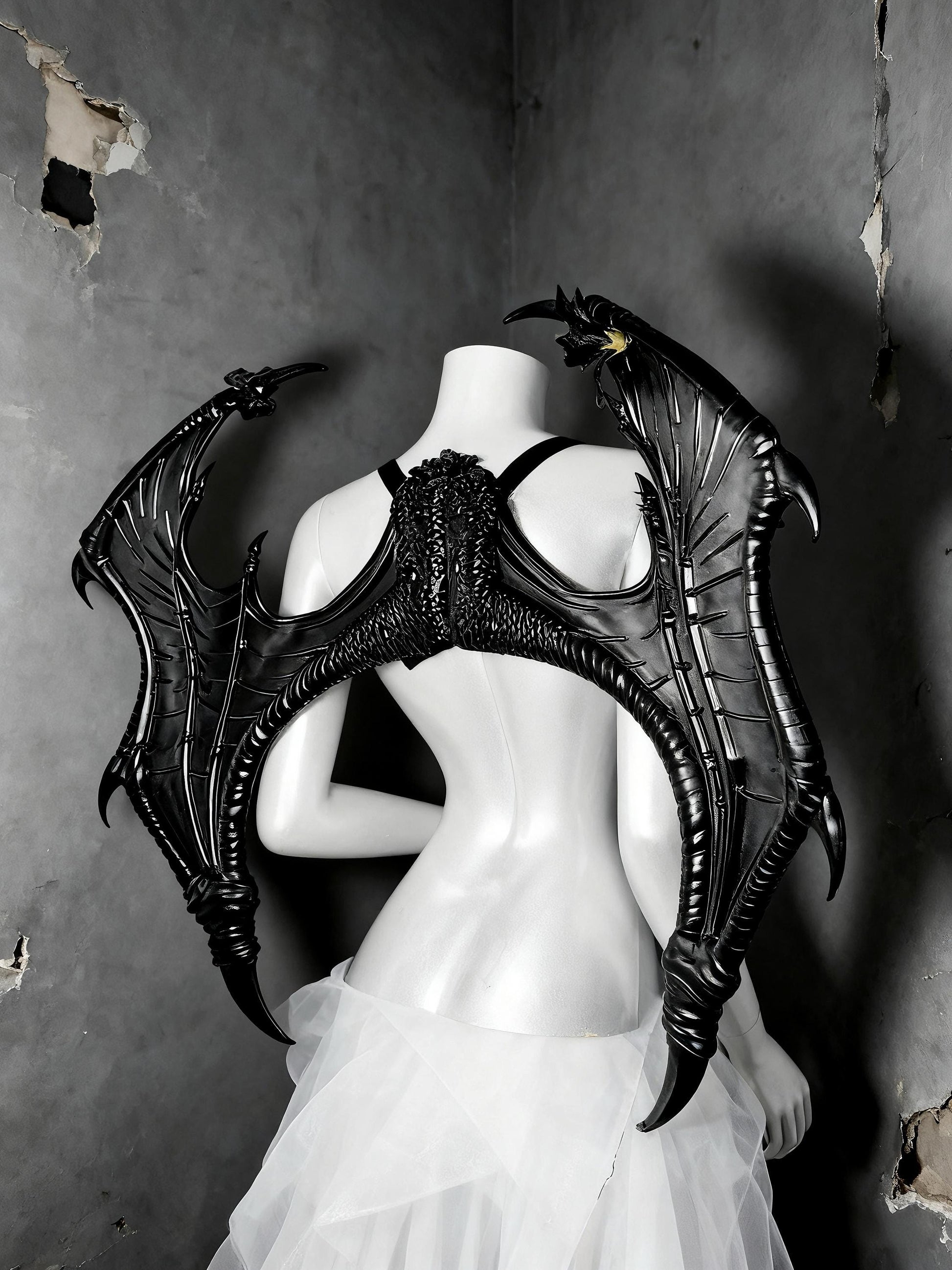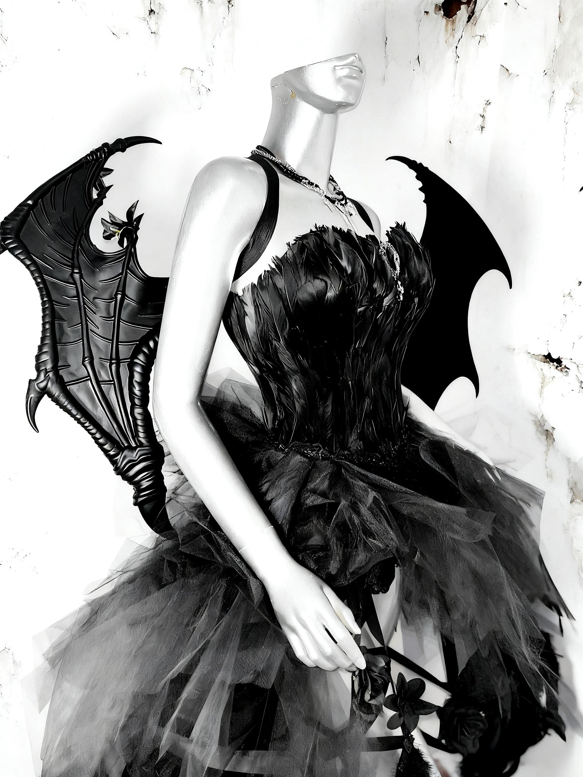 Dark Gothic Rave Festival Outfit – Black Feather Corset Gown with Dragon Wings, Fantasy Cage Skirt Dress for Halloween & Shows, Cosplay