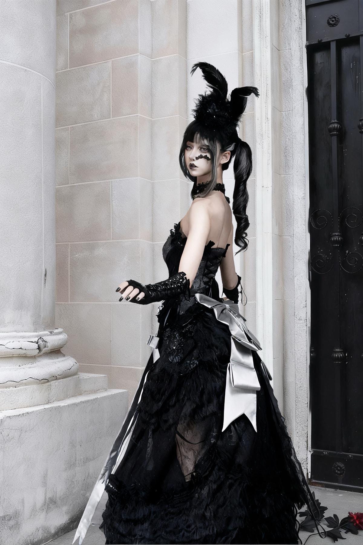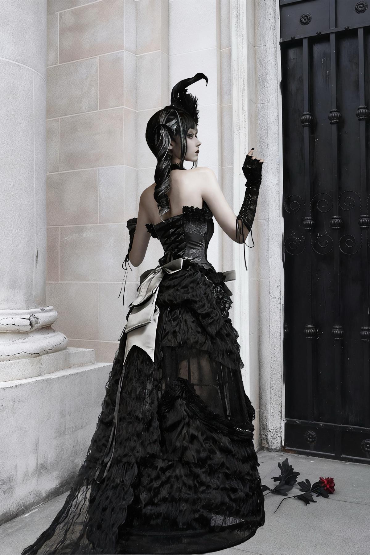 The lace-up back ensures an adjustable fit, sculpting a flattering silhouette with a touch of gothic charm. Perfect for gothic fashion, alternative styling, or statement festival wear.