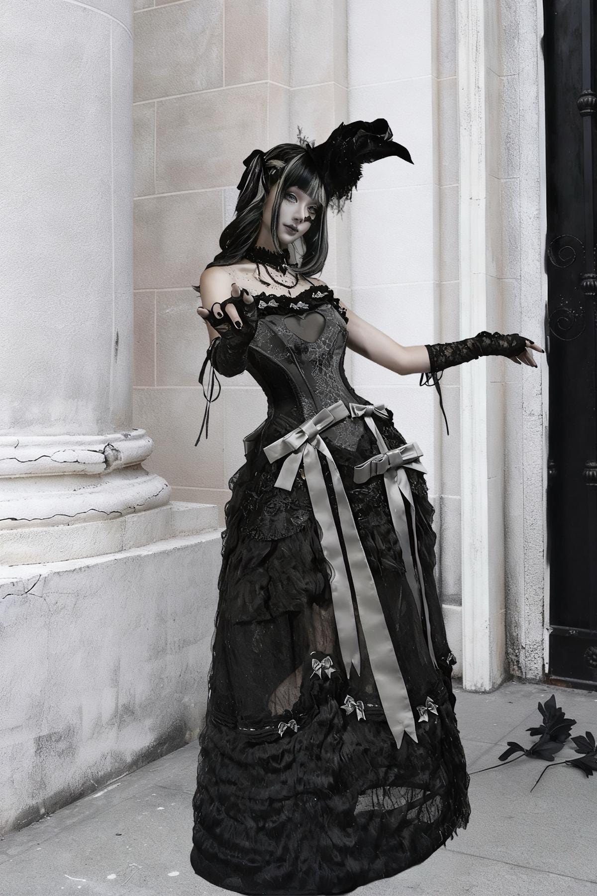Unveil your dark romance with this heart-shaped gothic corset top, crafted from textured jacquard fabric with delicate sheer black mesh at the bust. Finished with pure cotton lace ruffles and elegant ribbon trims, this corset blends sultry mystery with vintage elegance.