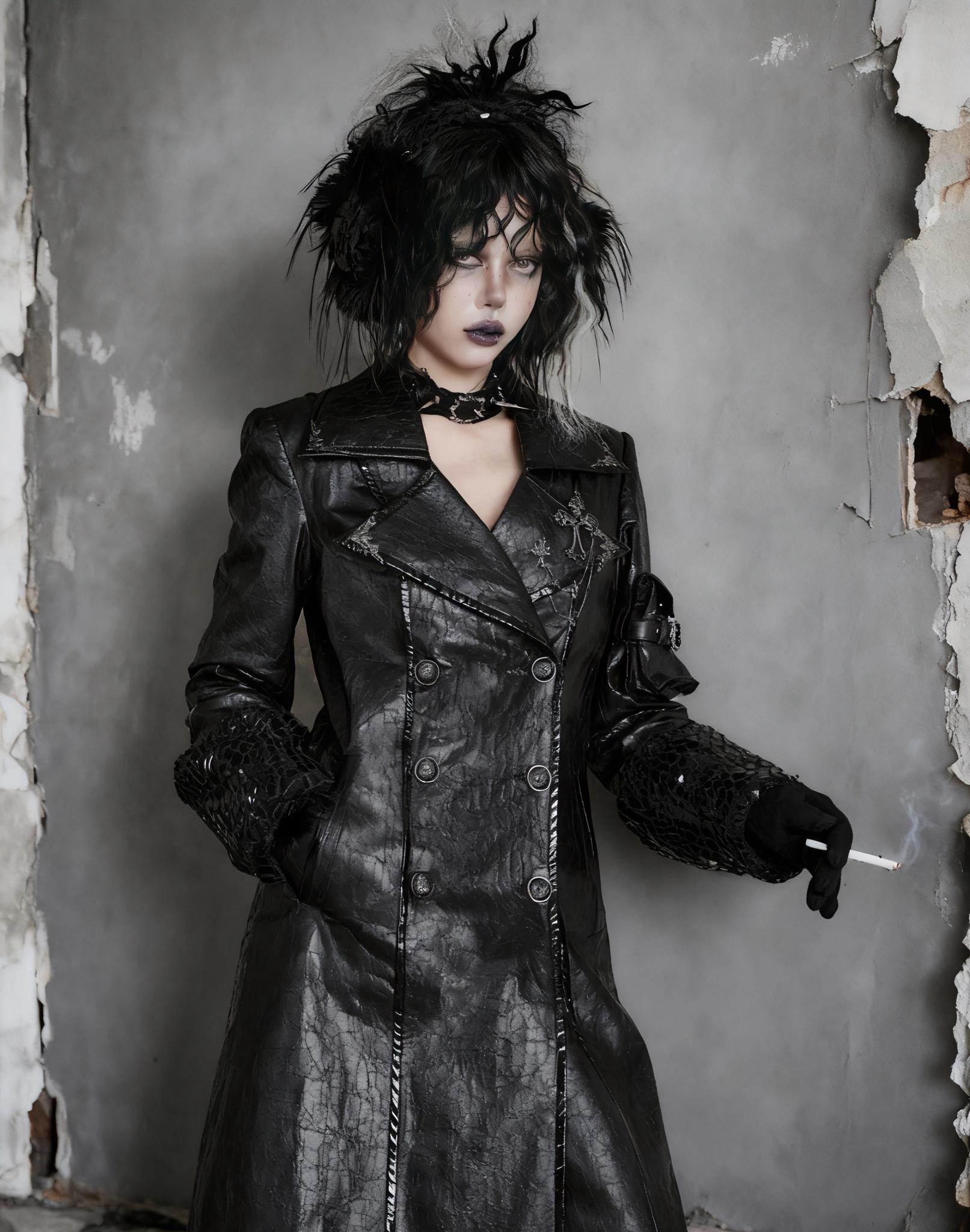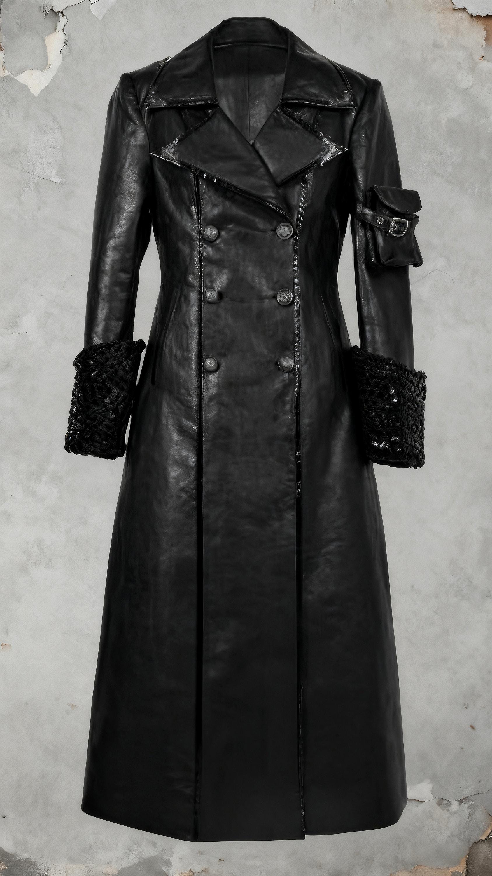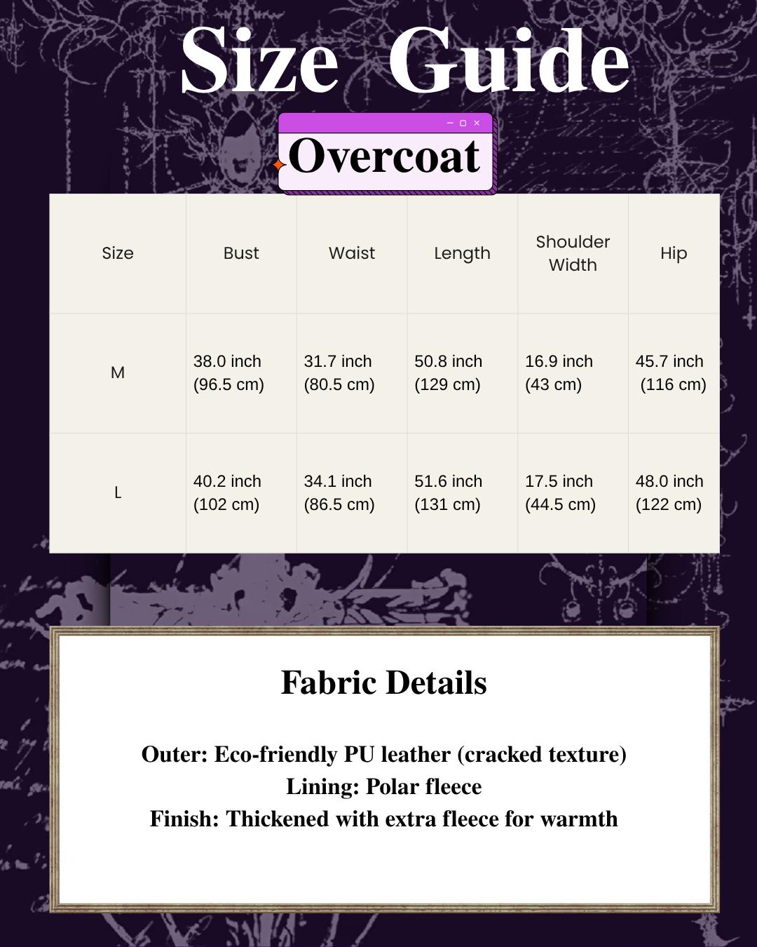 Step into the winter darkness with this Gothic Double-Breasted Overcoat, crafted from cracked-texture vegan PU leather and lined with soft polar fleece for extra warmth.