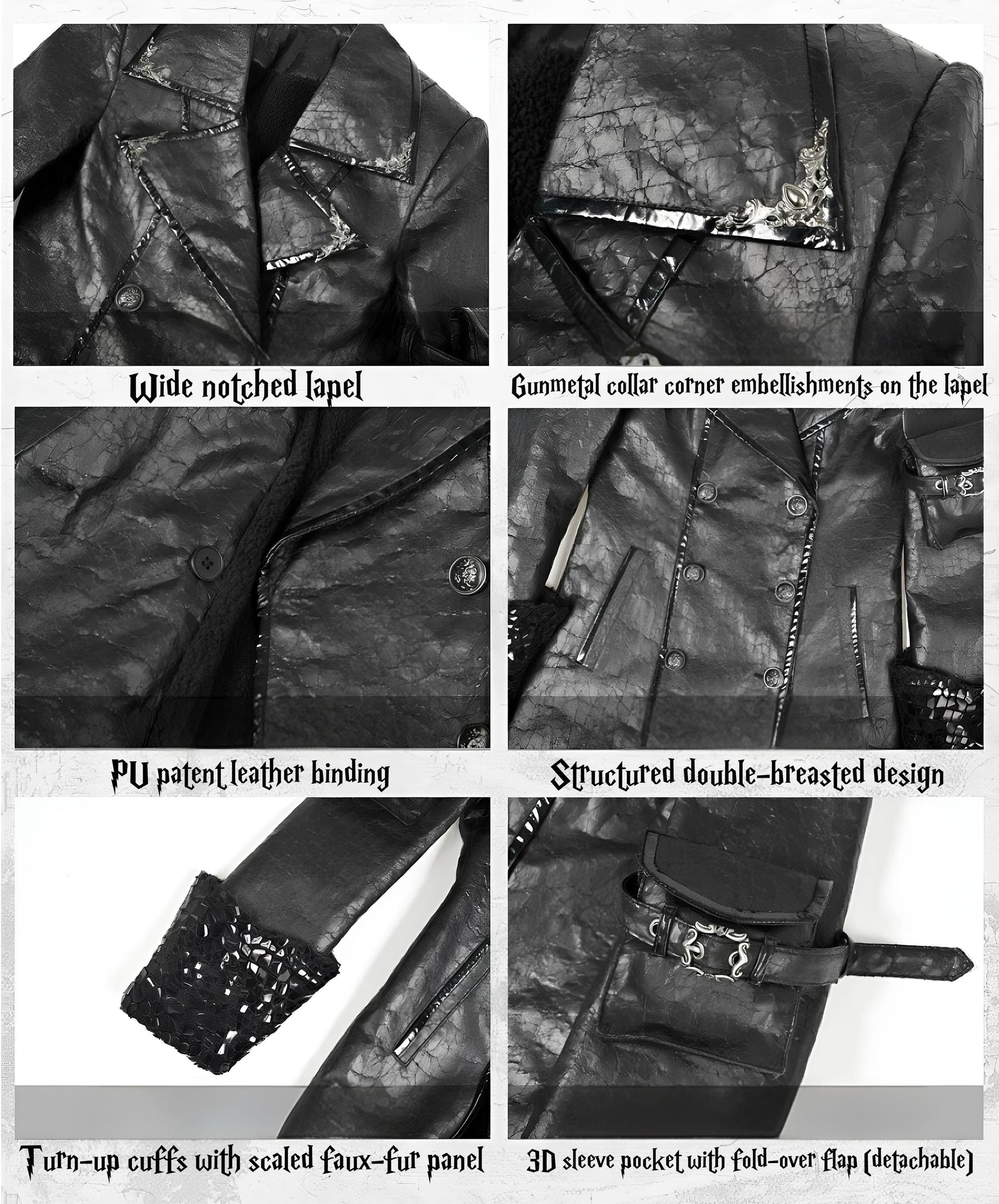 ✨ Detailed trims – gunmetal corner embellishments, glossy PU piping, and scaled faux-fur cuffs for a gothic edge.