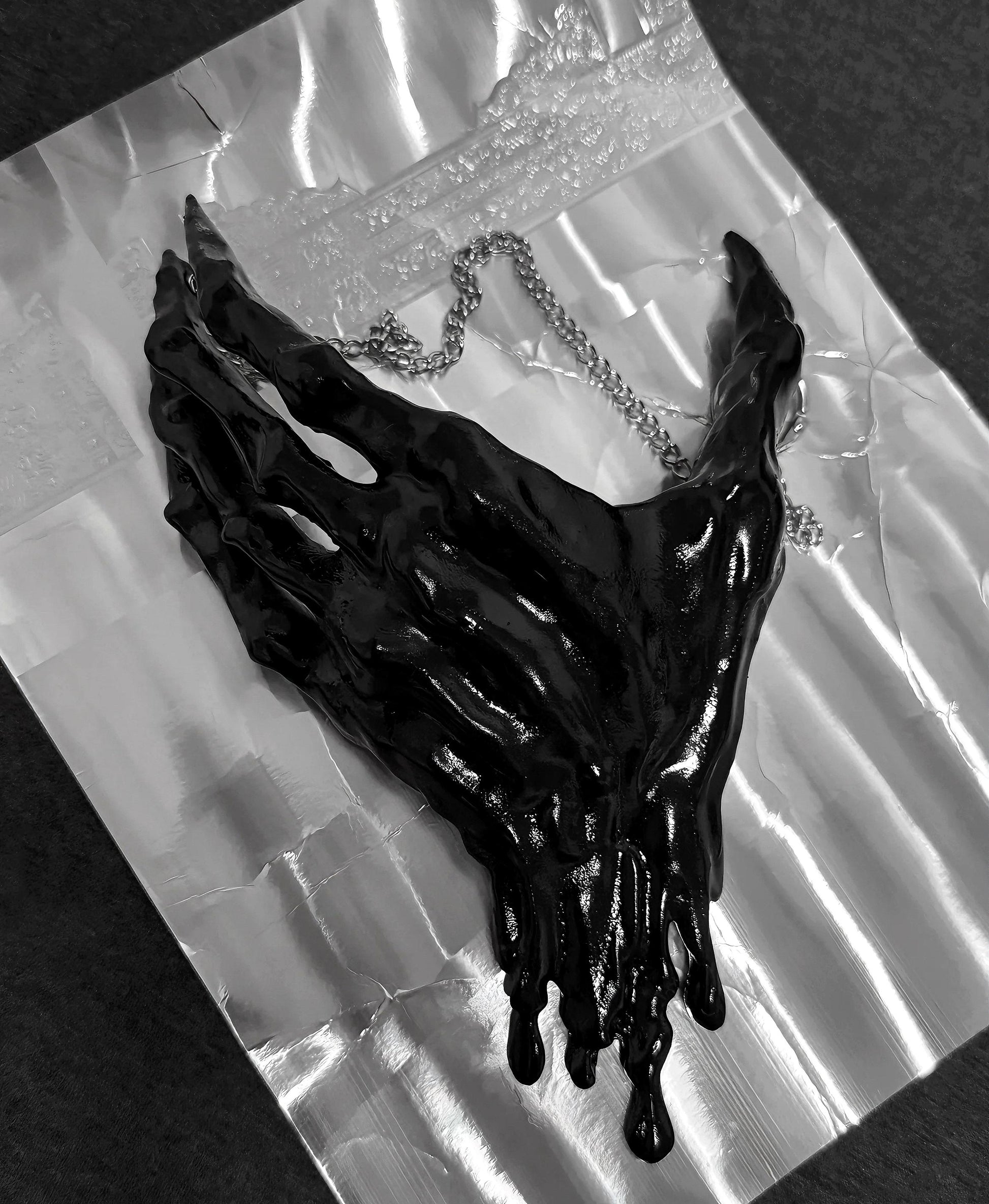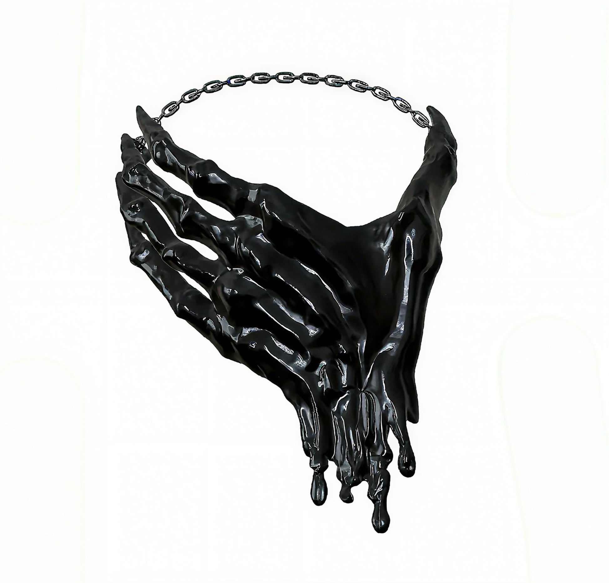 Unveil your dark elegance with this 3D printed Gothic Skeleton Hand Necklace, available in Blood White and Midnight Black versions.
