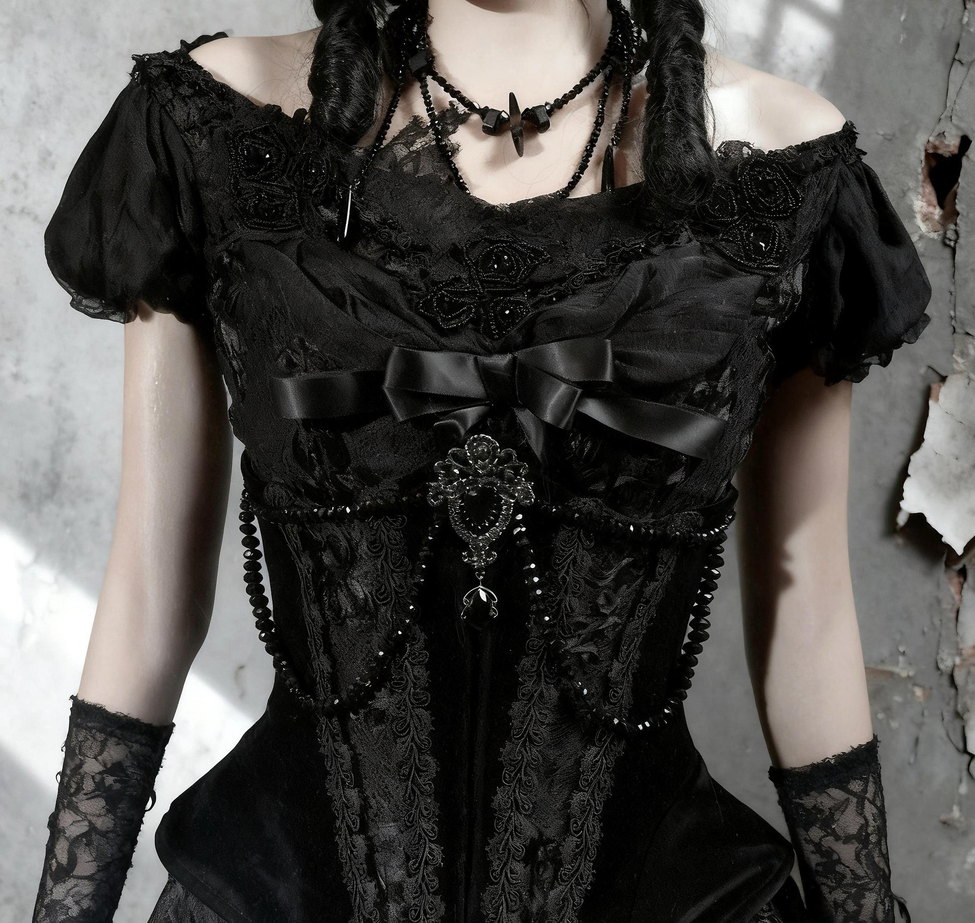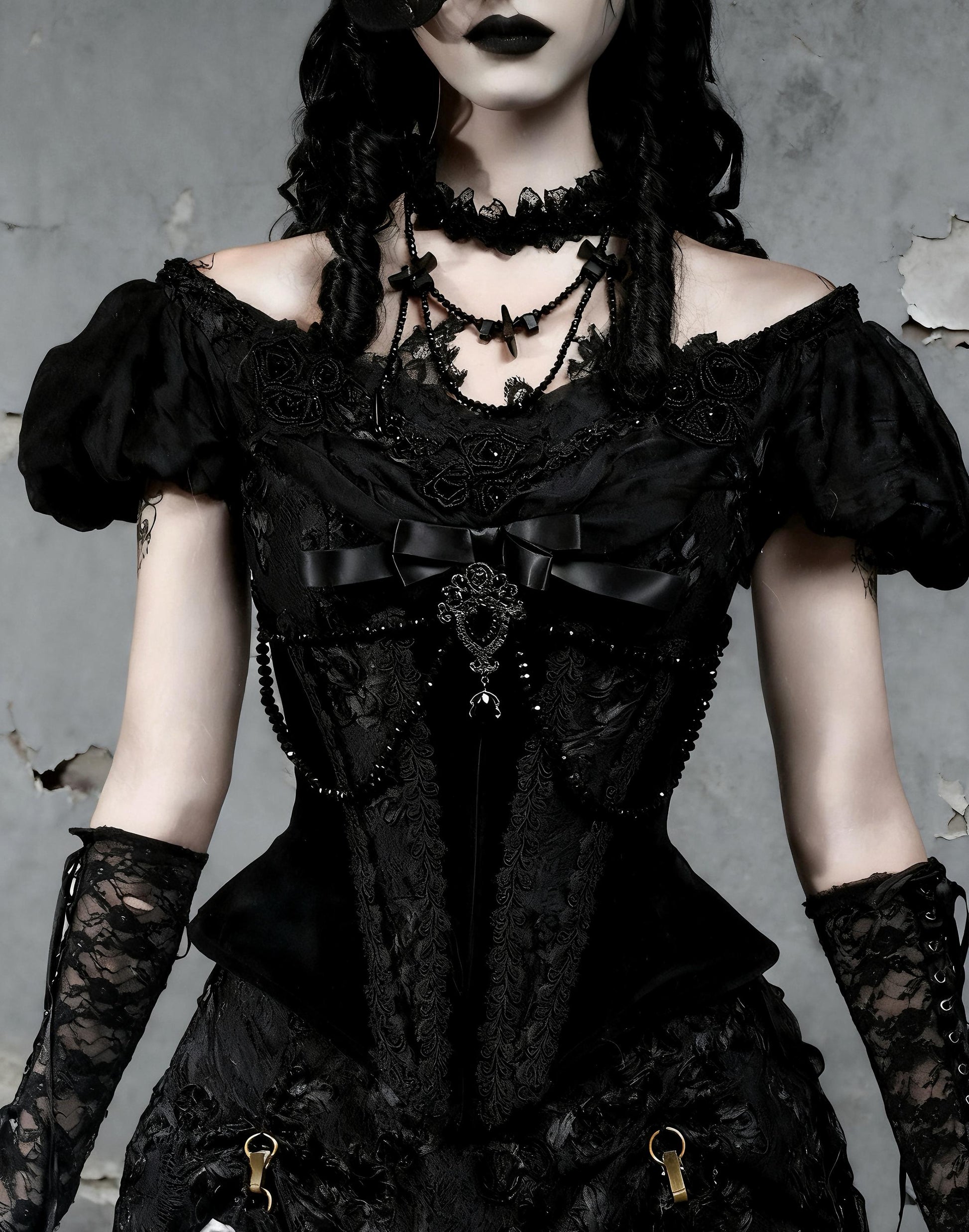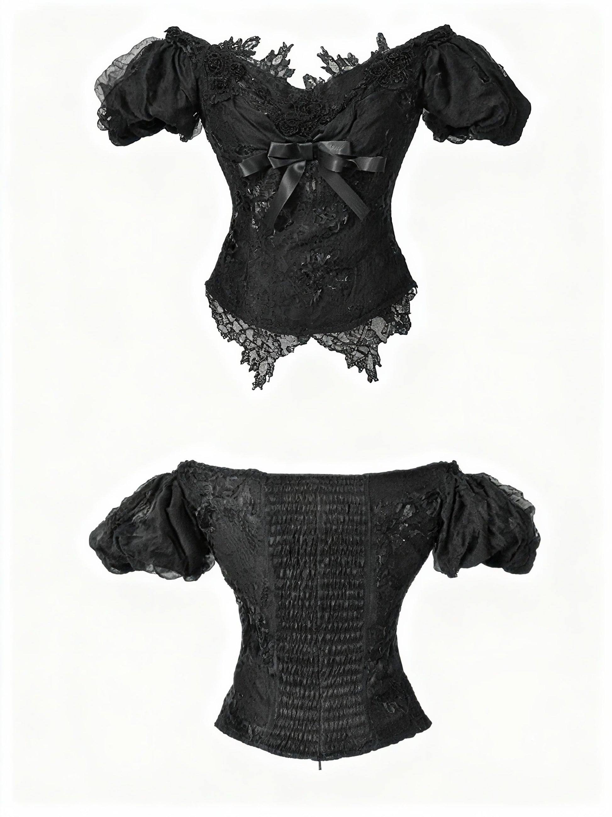 -Lace Top – Off-shoulder puff-sleeve blouse with intricate lace trim and satin bow accents, blending elegance with a dark allure.