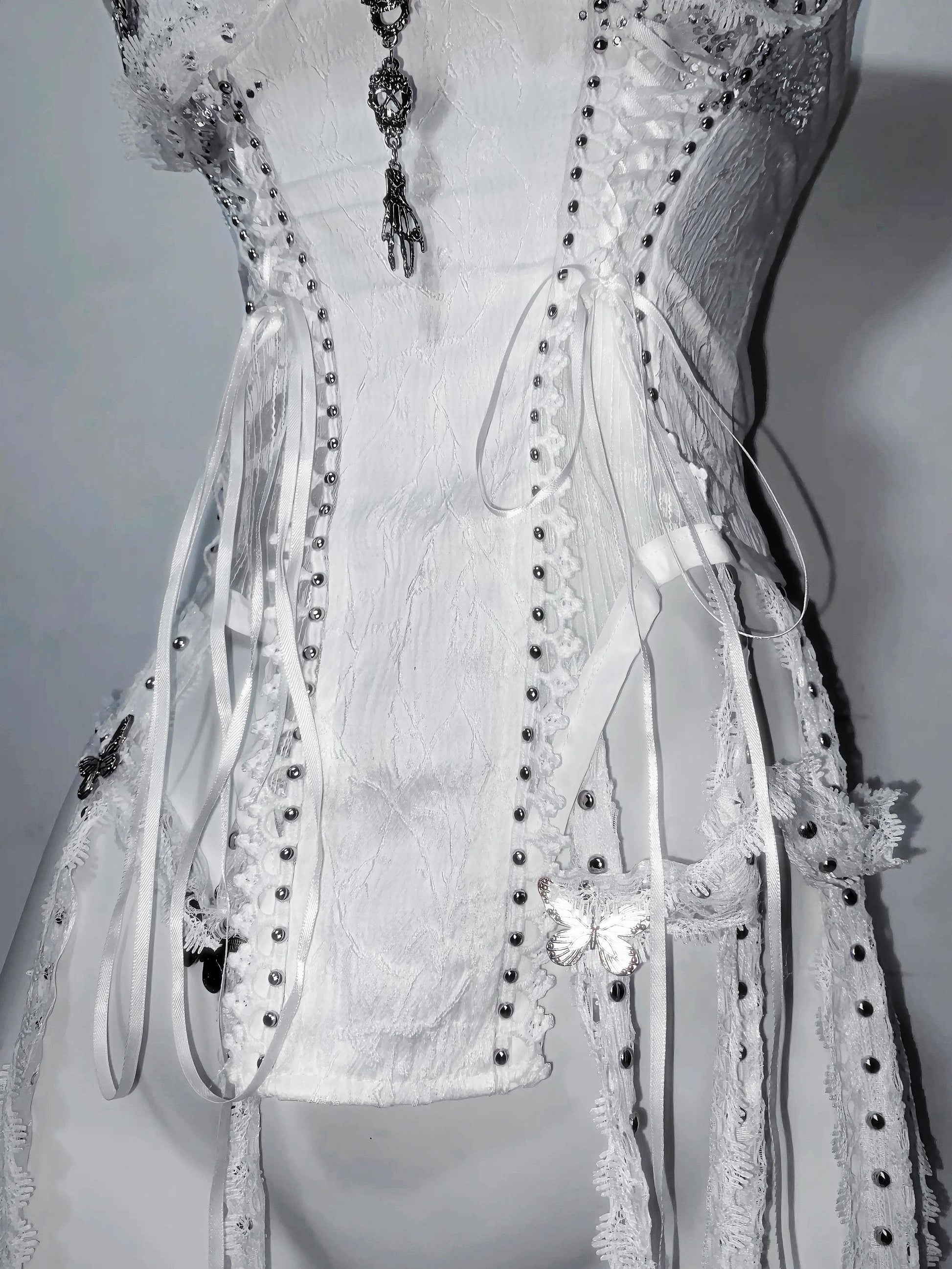 White Gothic Corset: Skull & Butterfly Bustier with Silver Chains, Dark Bride Halloween Costume, Xmas angel Cosplay Outfit
