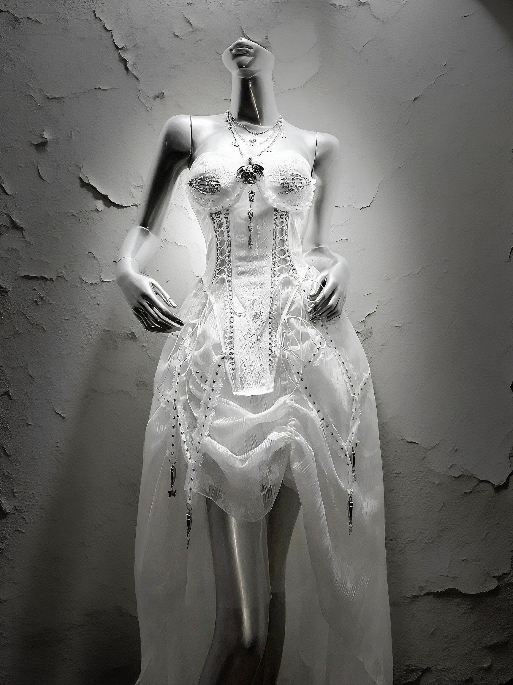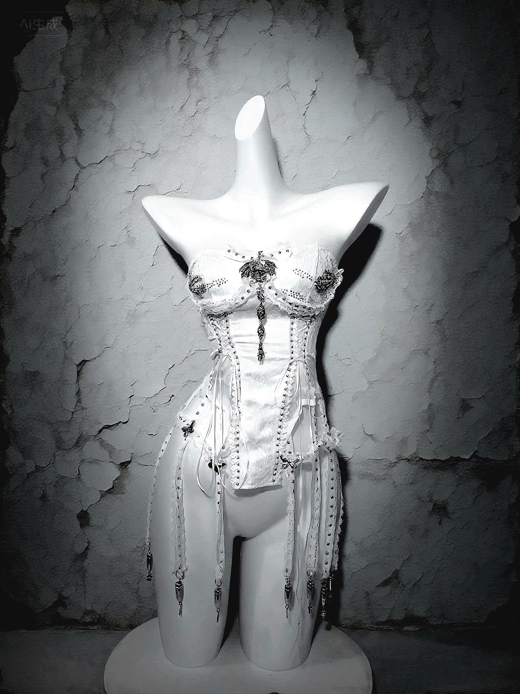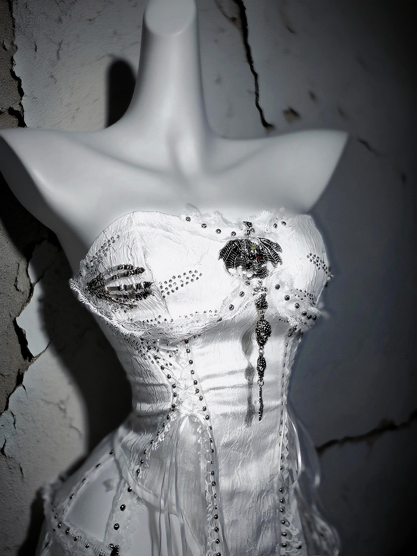 Unveil your dark celestial side with this Fallen Angel White Gothic Corset, a handcrafted piece blending purity with gothic edge. Made from custom embossed jacquard fabric, it features 6 steel bones for sculpting support, ensuring both structure and comfort without deformation.