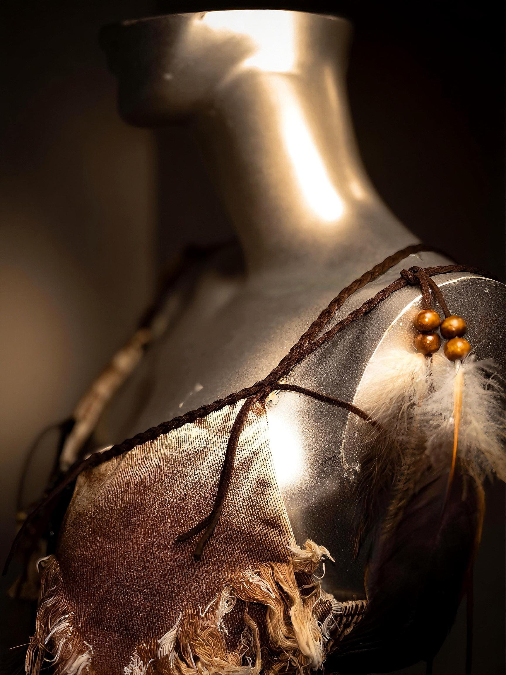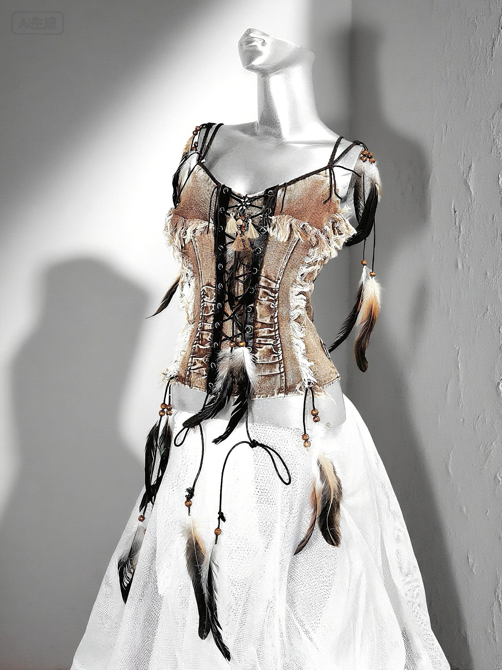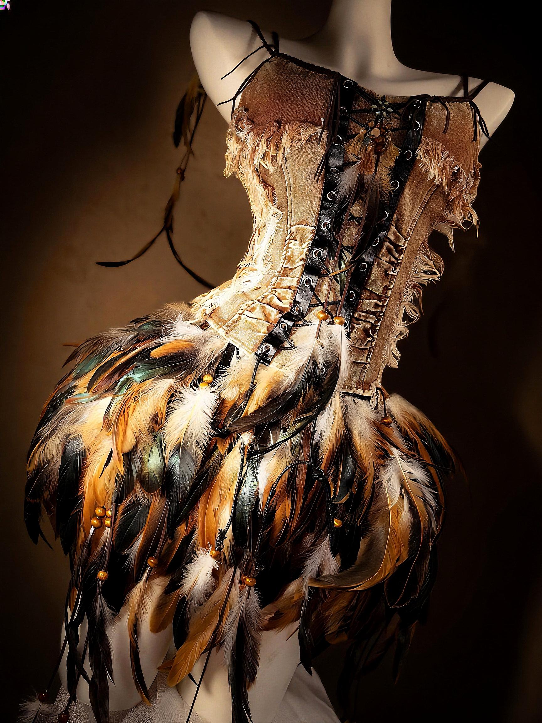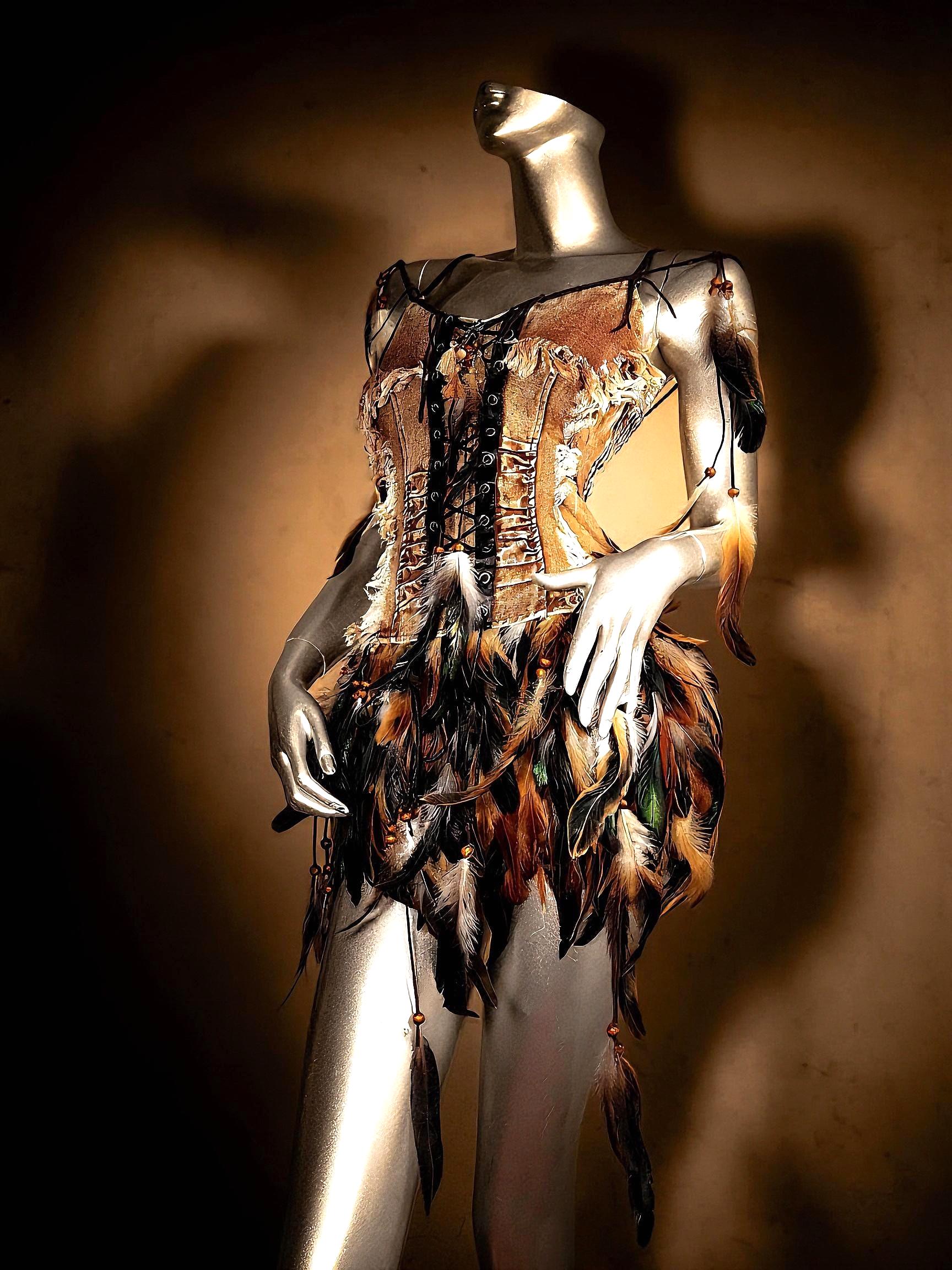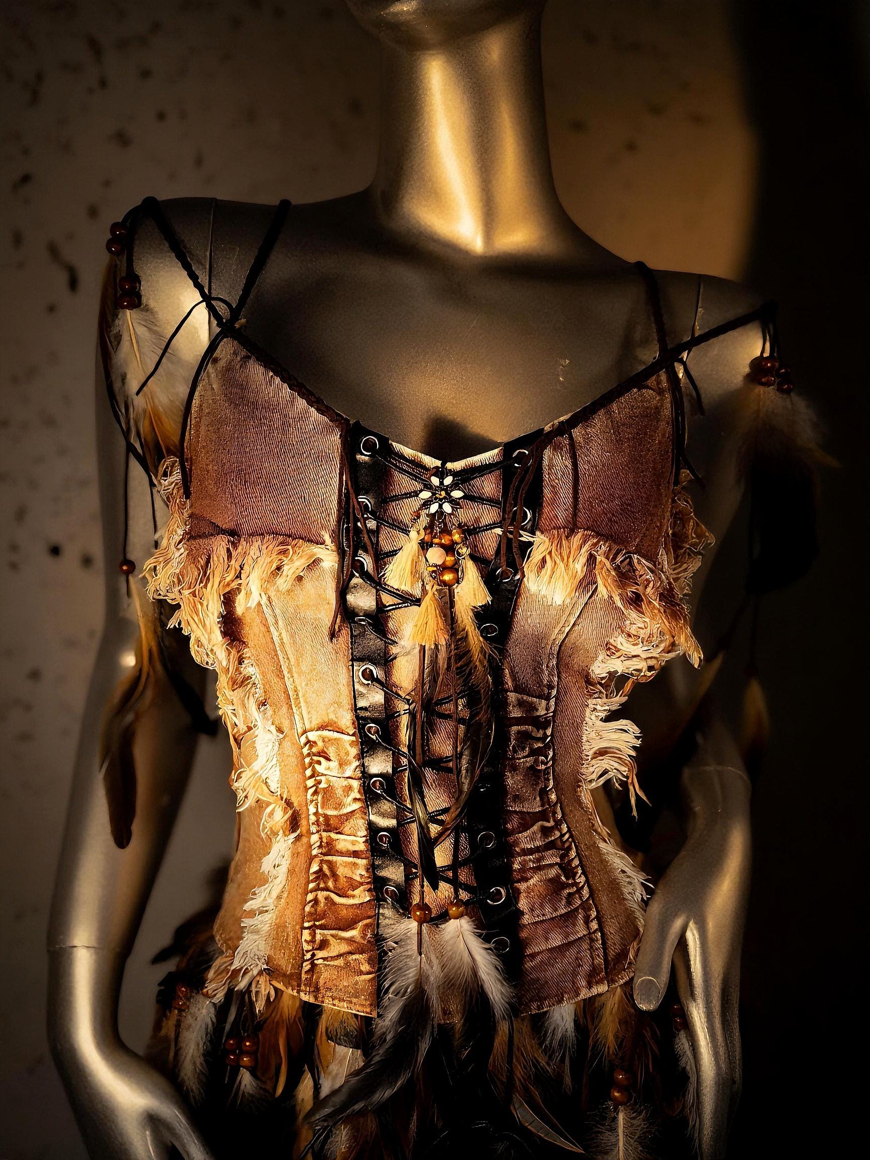 Embrace wild elegance with this Tribal Feather Goddess Set, featuring a washed denim corset top paired with a dramatic brown feather skirt. Inspired by tribal totems and earthy textures, this outfit brings together raw nature and hand-crafted detail, making it perfect for statement looks.