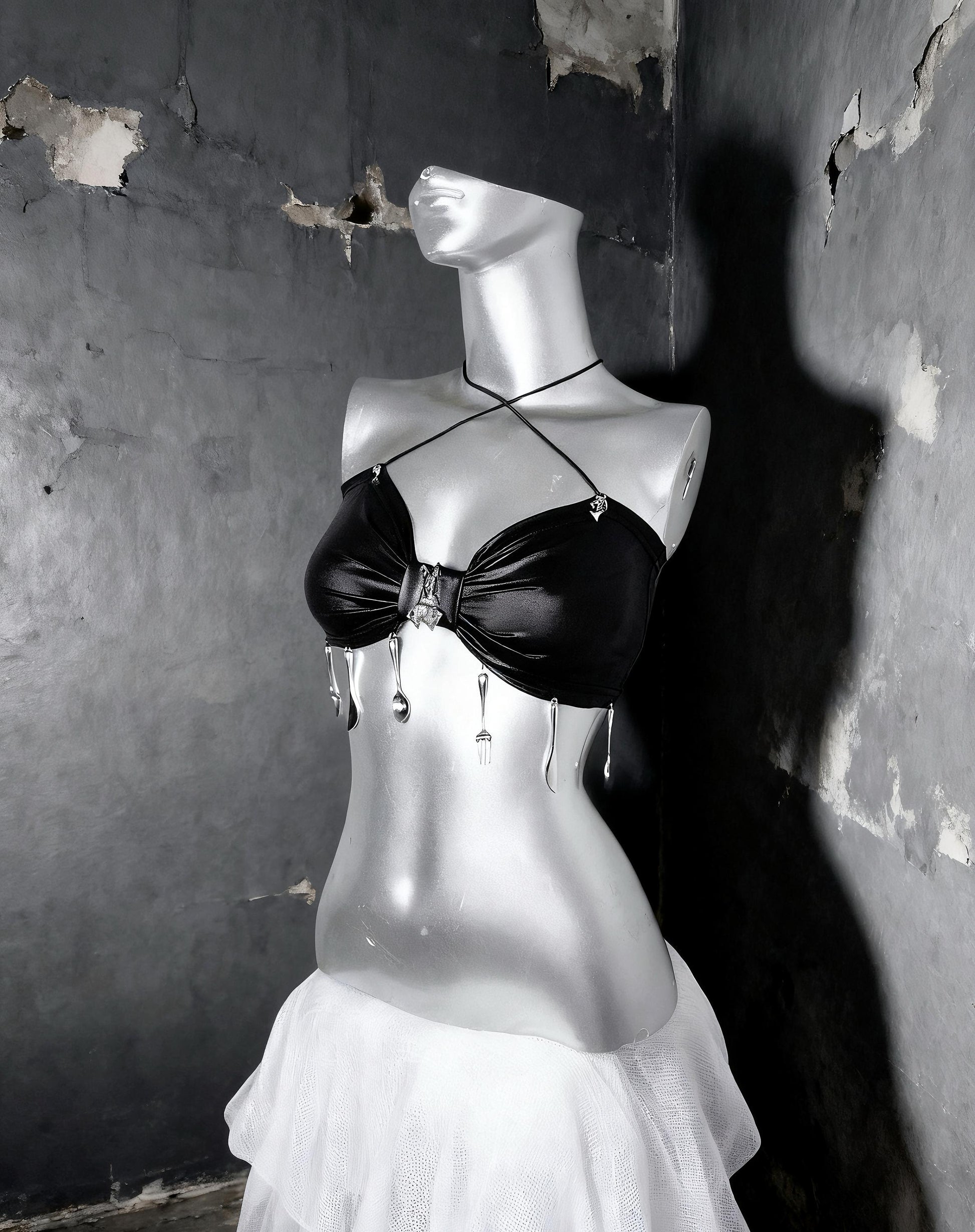 ✔ Vegan leather bandeau crop top – featuring metal charm accents, strappy neck detail, and edgy gothic hardware.